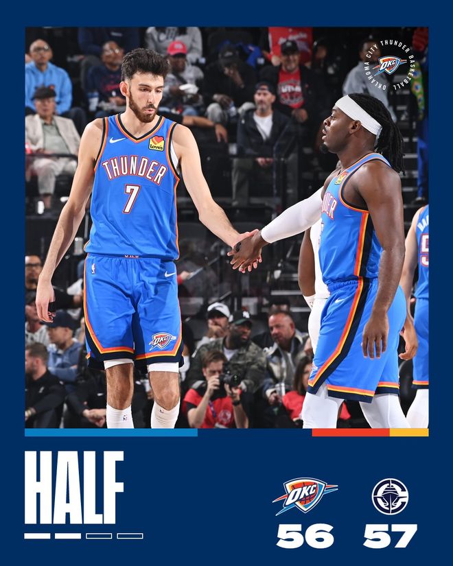 维金斯命中两球,他率队连追6分开始第二节,雷霆队只落后4分。科林斯发力连取6分帮助快船队重新拉开,多尔特和米切尔追回5分,科林斯保持手感又中三分,哈登也单打得手,半场前4分45秒时快船队以46-40领先。华莱士三分中的,乔也跑投三分命中,雷霆队追成48平。51平后琼斯底角投中三分,邓恩两罚一中,快船队重新领跑。乔和亚历山大联手5分帮助球队反超,祖巴茨空接扣篮,半场战罢快船队以57-56领先1分。